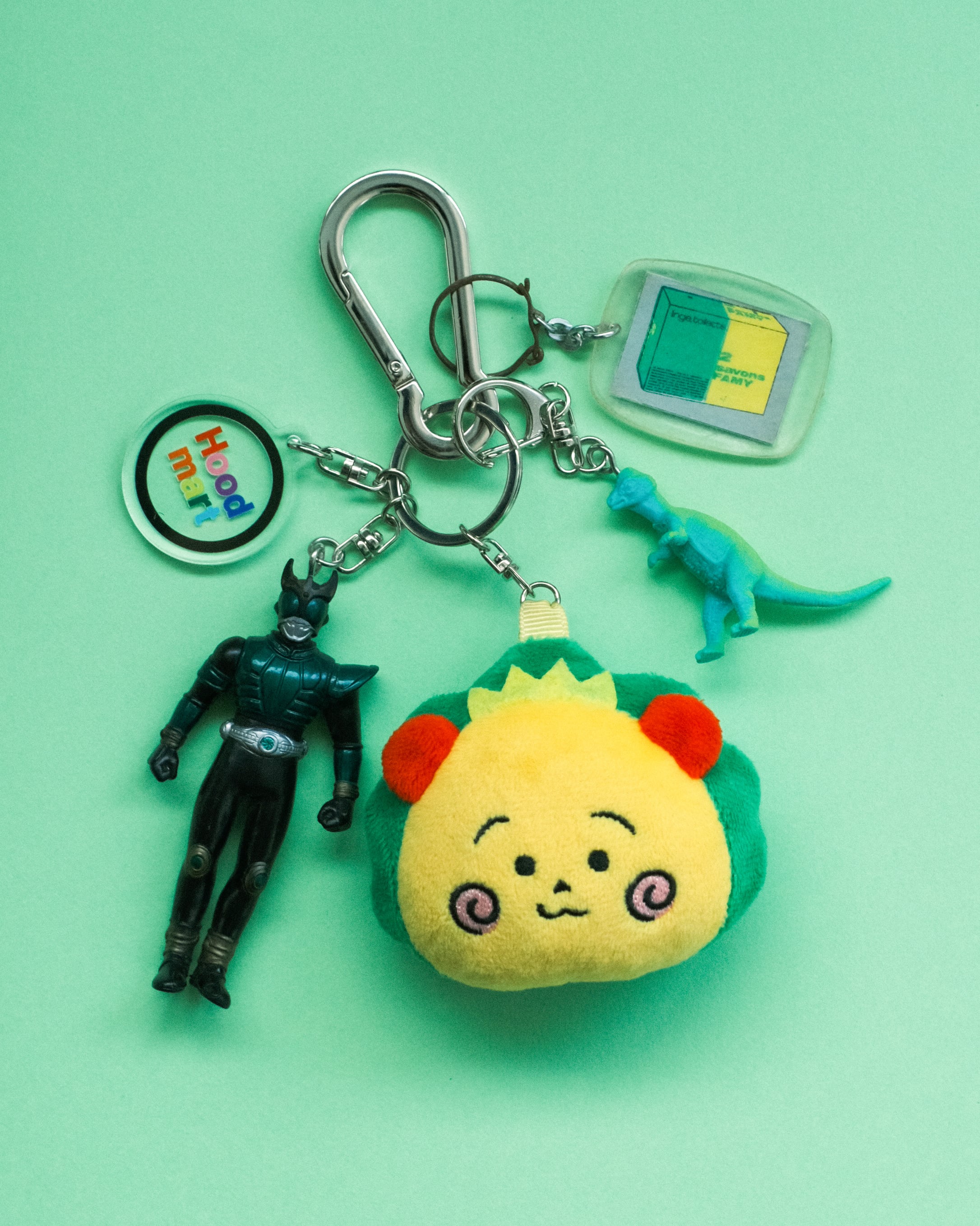 ジャラジャラ感を出すために、Hoodmartがセレクトする60~80年代のヨーロッパのキーホルダーや恐竜のキーホルダーを合わせています。