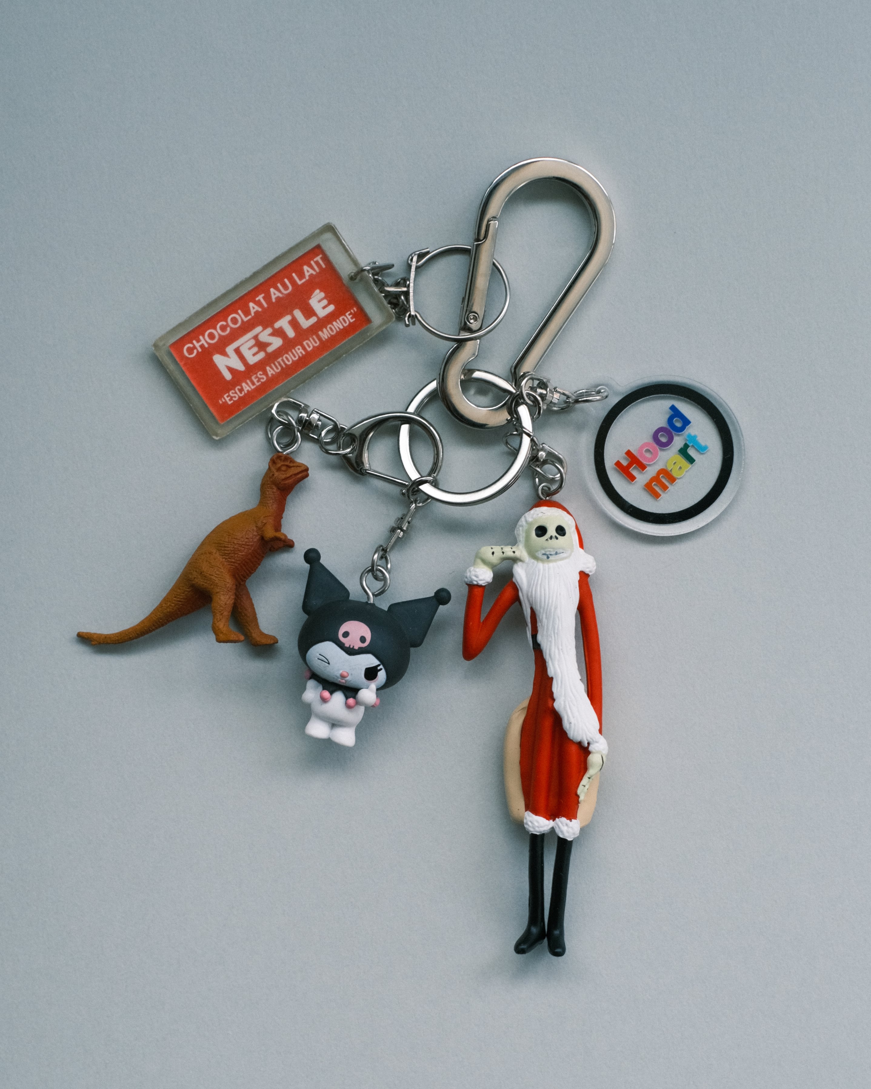 ジャラジャラ感を出すために、Hoodmartがセレクトする60~80年代のヨーロッパのキーホルダーや恐竜のキーホルダーを合わせています。
