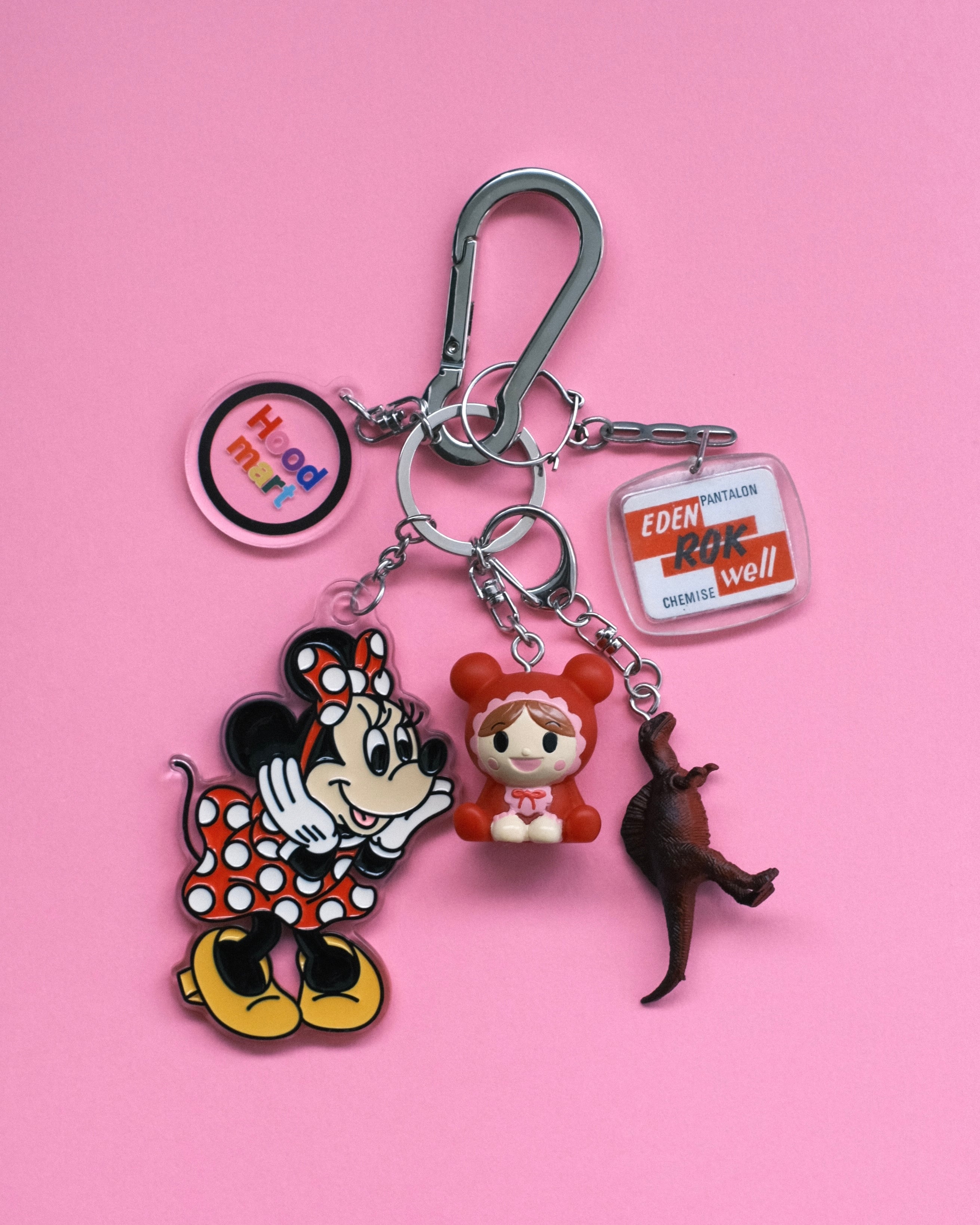 ジャラジャラ感を出すために、Hoodmartがセレクトする60~80年代のヨーロッパのキーホルダーや恐竜のキーホルダーを合わせています。