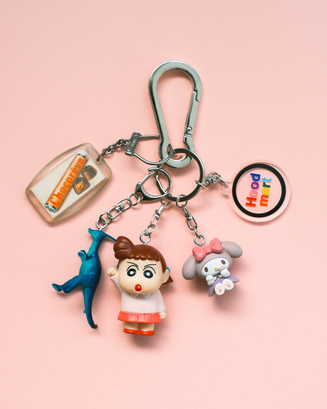 ジャラジャラ感を出すために、Hoodmartがセレクトする60~80年代のヨーロッパのキーホルダーや恐竜のキーホルダーを合わせています。