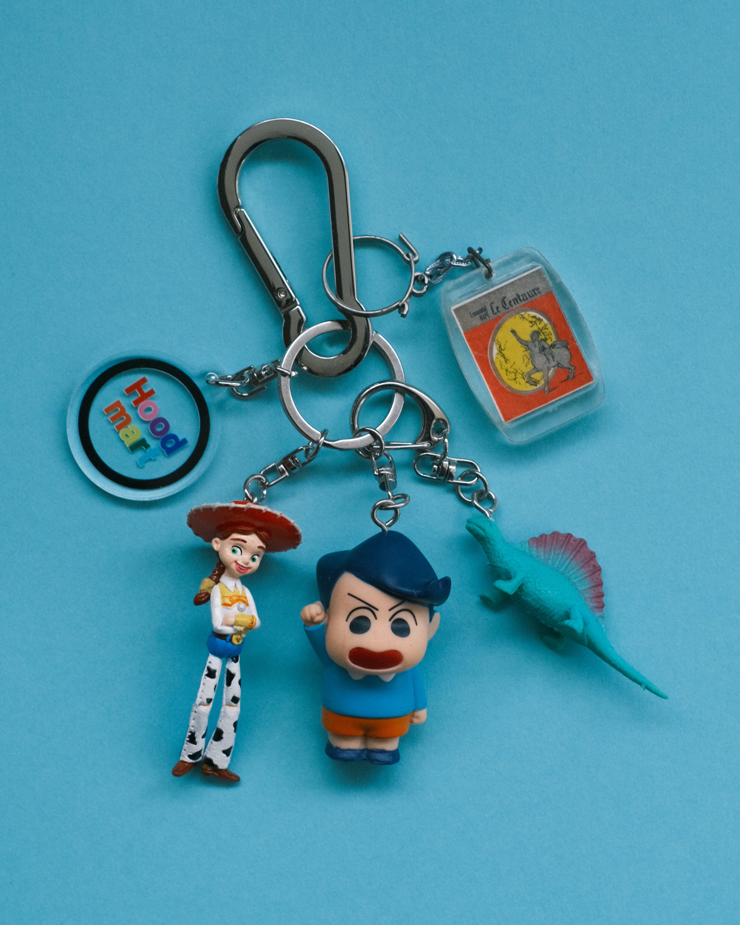 ジャラジャラ感を出すために、Hoodmartがセレクトする60~80年代のヨーロッパのキーホルダーや恐竜のキーホルダーを合わせています。